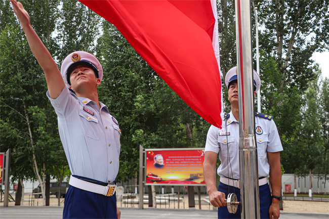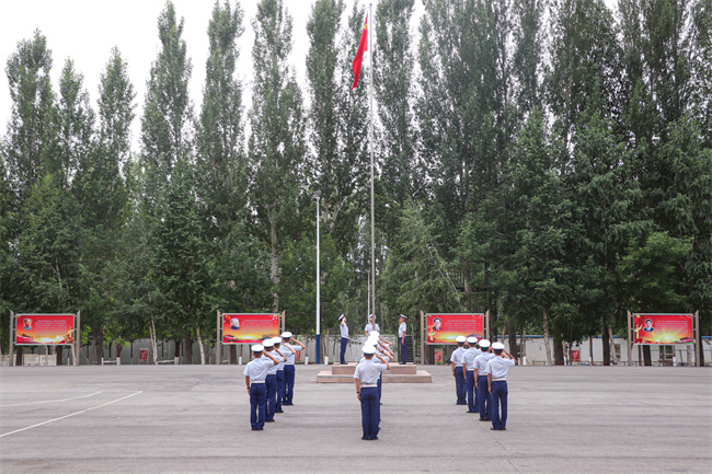 上午10时,升旗仪式正式开始。全体消防救援人员整齐列队,肃目而立。伴着激昂的《义勇军进行曲》,英姿飒爽的护旗手迈着铿锵有力、整齐划一的步伐,护送着鲜艳的五星红旗走向国旗台。