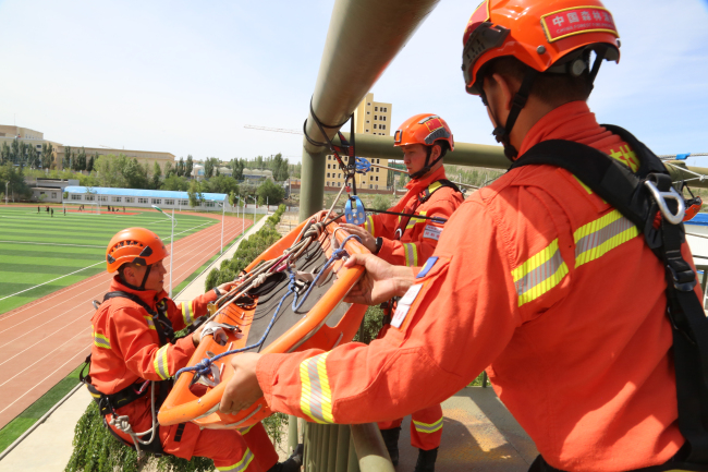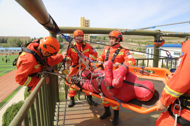 “一二一二……”伴着响亮的号子,60公斤假人在吊篮式担架承载下成功脱困。