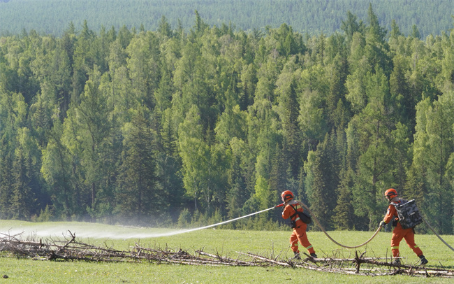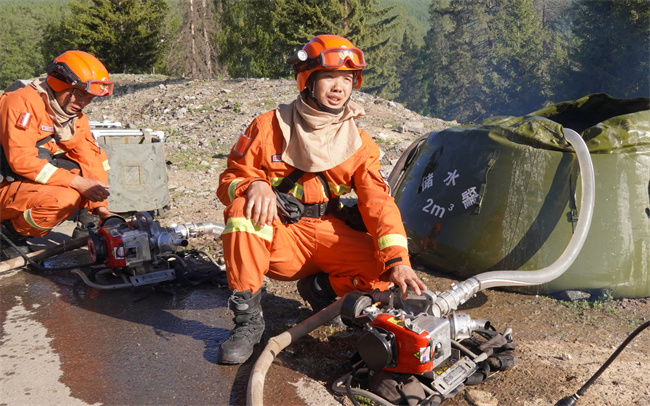 “1号水泵已出水、2号水泵已出水、3号水泵已出水、烟点已扑灭、水泵已撤收完毕……”在茂密的林场中身着橙红色防护服的森林消防员来回穿梭,额头上的汗珠一滴滴落下。
