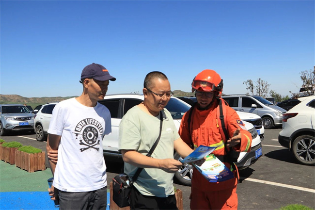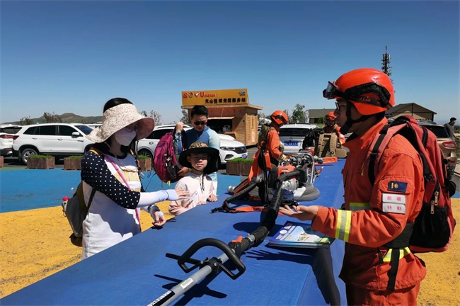 “小朋友你好!森林防火知识请你了解一下,还可以体验叔叔们的消防装备哟。”指战员热情的迎上去给景区游客和过路群众发放森林防火宣传单,并设置装备展示体验区,将传统的“灌输式”变为“体验式”,这种防火手册和装备体验相结合的“套餐”更能牢牢抓住的群众的好奇心理,真正让他们停下脚步仔细聆听指战员讲解森林防火知识。