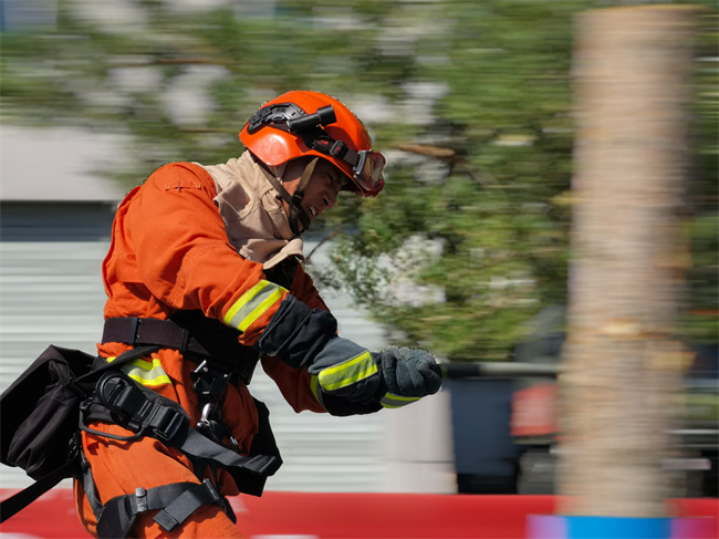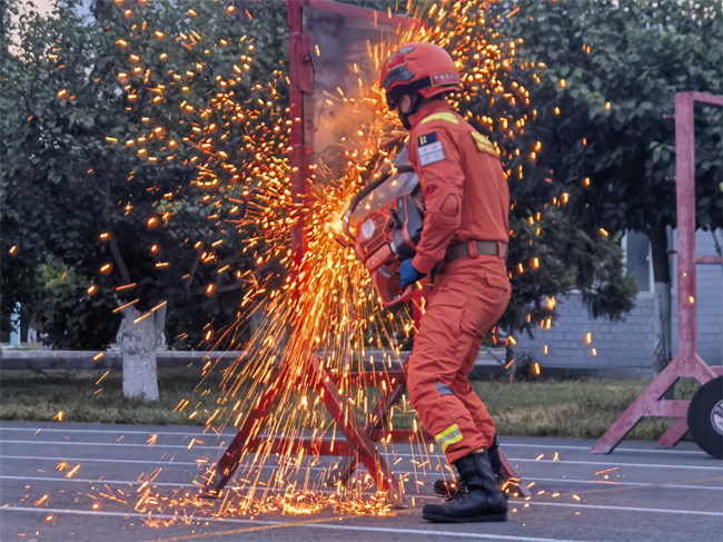 烈日当空,在炎热的灭火专业技能综合竞技训练场上,每一滴汗水、每一分钟的坚守都是对比武人员极大的考验。此课目中包含单泵架设与撤收、风力灭火机操作与使用、油锯切割、水枪灭火、灭火弹投掷、心肺复苏等多样化技能科目,一整套下来每个比武队员动作行云流水,场面极度舒适。