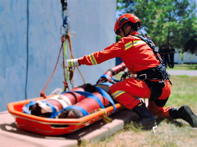 特殊地形烟点处置是以野外陡壁灭火为背景,充分考验指战员在面对特殊地形时应对办法及处置能力,需要消防员克服自身心理障碍,利用绳索进行索降的方式下降至目标区域清理烟点,而后再利用器材返回原点,这是一项检验特殊地形条件下灭火技术及救援能力相结合的综合性科目,有效检验特殊地形条件下灭火、救援技术结合运用的能力。