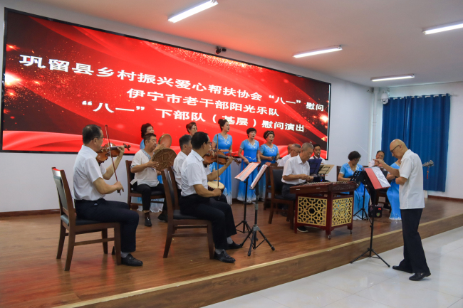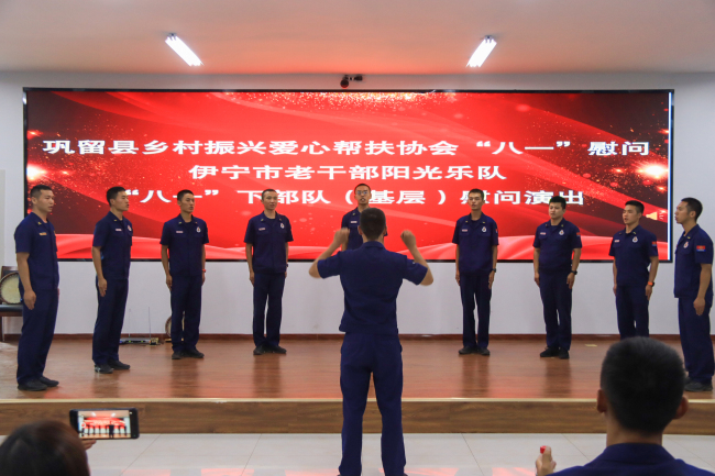 本网讯:(魏富满 吴渊)激扬的音乐旋律,传达着热情与爱戴;壮美的舞蹈,映射出豪情与青春。“八一”来临之际,巩留县乡村振兴爱心帮扶协会携手伊宁市老干部阳光乐队走进巩留县森林消防大队,慰问长期奋战在一线的森林消防指战员,为大队全体指战员送上精彩的慰问演出,向大队全体指战员致以崇高的敬意和真挚的问候。大队全体指战员观看表演。