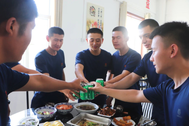 要想抓住新消防员的“心”,首先要先抓住他们的“胃”。大队提前谋划,炊事员各尽其能,为新消防员准备了一顿丰盛的大餐。一上桌,新消防员就埋头于美食的海洋,老消防员们也打开了话匣子,一边吃喝,一边增进感情,让新消防员第一次体验“家庭会餐”的美好,同时也让他们消除了在陌生环境的紧张感,进一步感受到大家庭的温暖。