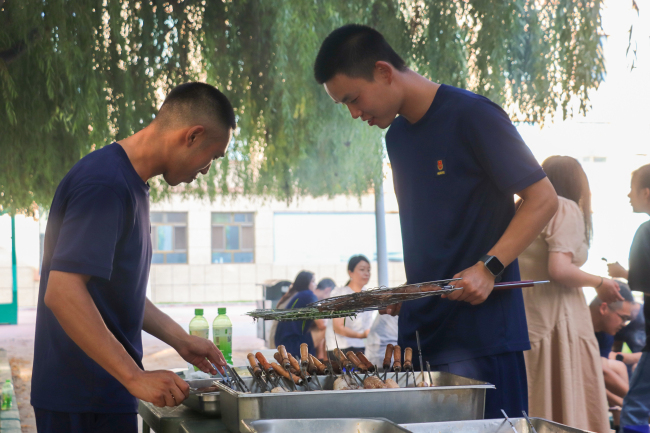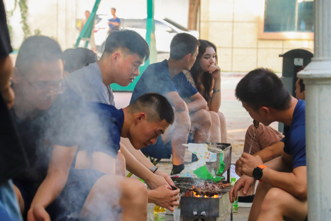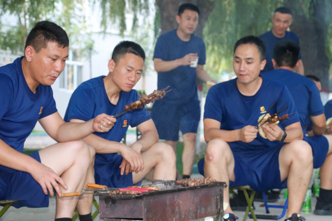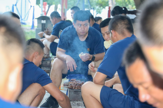 “没有了烟火气,人生就是一段孤独的旅程”,这句话,简直就是为烧烤量身定制,一架烤炉,几块红炭,缕缕炊烟,抚慰人心。大家暂时放下平日的严肃紧张,想吃什么就自己动手烤什么,每个人都成了烧烤师傅,他们在欢歌笑语中分享着自己的手艺,烧烤的香味及趣味伴随着那一张张笑脸弥漫在整个营区。