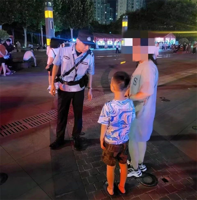 由于晚会现场人多复杂,为了小孩子的安全,民警将小孩带到文化广场安静处,安抚孩子情绪后耐心询问其家人的信息,由于孩子紧张表述不清,并没有得到有价值的信息,民警一边带着孩子在广场内寻找,一边在广场外围四周进行寻找,经过民警的不懈努力,大约半小时找到其家长,看到孩子安然无恙,男孩家人对民警连连道谢。