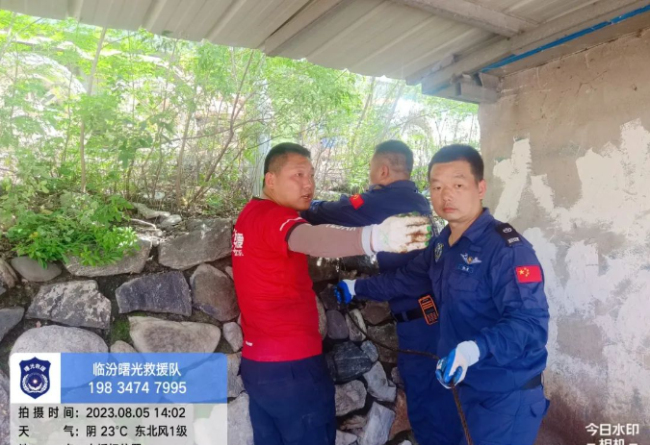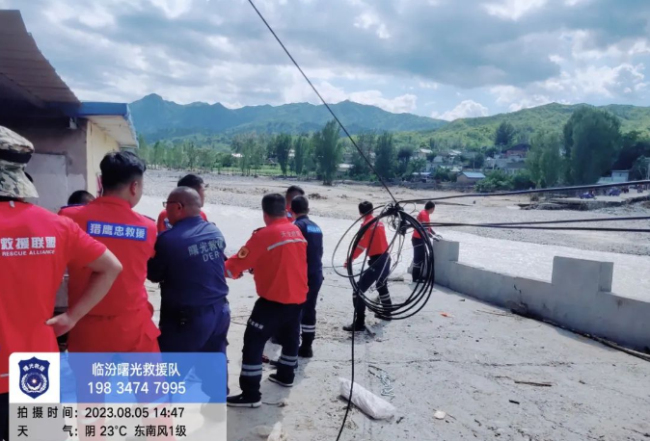 8月5日8:00在涞源东高速口与尧都天龙救援队汇合,为方便受灾群众转移生活物资,协助执行搭建横渡系统,17:30完成搭建任务,撤离山区后短暂休整,23:00启程星夜兼程。