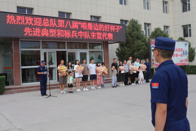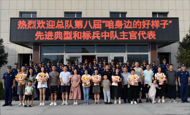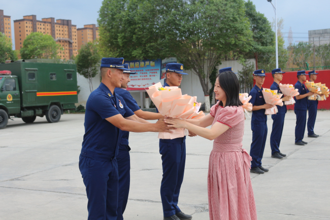 大队全体消防救援人员整齐列队“敲锣打鼓”,第一时间送上鲜花,以热烈的掌声、喜庆的锣鼓声迎接先进典型和标兵中队主官代表及家属的到来。