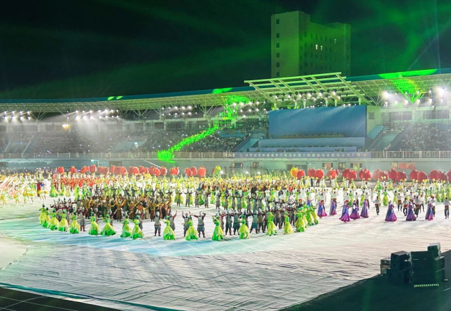 自治区第十四届运动会开幕式由入场仪式、文体展演两部分组成,文体展演主题是“天山之约”,意在突出新疆以体育之名,盛邀八方宾朋,相约天山,欢聚巴州,共襄盛会。文体展演包括:序章《鼓舞天山》、第一章《丝路天山》、第二章《文润天山》、第三章《活力天山》和尾章《奋进天山》。
