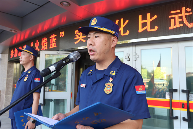 仪式上,张浩利副支队长宣读支队参加总队“火焰蓝”实战化比武竞赛方案,明确了指导思想、时间地点及主要内容。随后,比武人员代表作了表态发言,表示不负重托,勇夺先锋,保持强烈的集体荣誉感,矢志笃行,赛出风格、赛出水平,赛出支队风采。