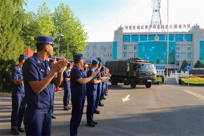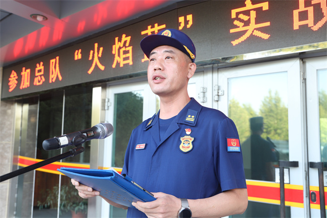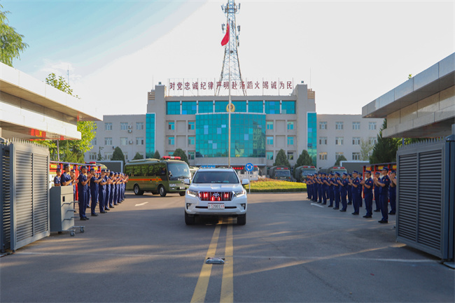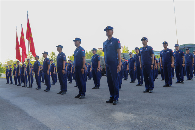 仪式最后,赵永波代支队长作了动员讲话:一要高度重视,科学统筹。全体比武竞赛人员和保障人员,必须充分认清此次比武竞赛的重要意义,在思想上和行动上紧跟上级党委的决策部署,谋训研训,团结协作,把工作热情和主要精力聚焦到实战化比武上来。二要精研细训,奋力拼搏。“细节决定成败”。全体参赛人员要进一步熟悉比武规程,掌握比武细则和评分标准,团结协作、集智攻关,严格对照标准,沉着冷静、积极迎战。全体比武人员要自觉尊重裁判,服从裁决,增强临机应对能力,保持良好心态,绝不允许有任何顶撞裁判、干扰裁判工作的现象发生。三要相互学习,勇创佳绩。“狭路相逢勇者胜”。全体参赛人员要树立唯旗誓夺、永争第一的精神,做到团结互助、相互学习、取长补短,充分展示自我、挑战极限,创造优异成绩,比出成绩、比出风格、比出形象。四要压实责任,确保安全。此次比武参赛单位多、人员多,动用车辆多、路途远,道路复杂,训练场环境陌生,加之比武期间天气炎热,安全隐患较大。各单位必须树牢安全第一的思想,全体比武队员要遵守操作规程,坚决杜绝盲目蛮干,要将安全工作贯穿到比武活动的全过程,确保比武活动安全顺利圆满。