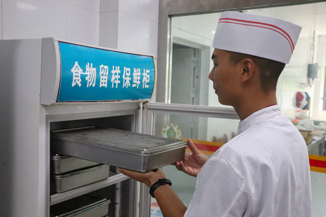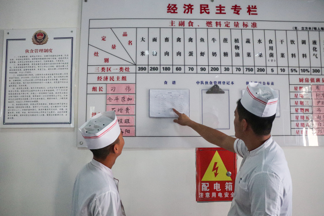 大队始终坚持从源头抓伙食保障安全,严把好食品管理关、制作关、清理关。每日对采购食品、厨具、餐具进行全面清洁消毒,厨房管理监督员不定期进行食品安全检查,逐一对食品的数量、重量、质量进行核对,确保在安全上不出问题,为食品的制作奠定基础。在加工操作规程上,要求炊事员必须穿戴好炊事服装,制作过程中做到生熟食品分开存放和加工,食品加工、肉禽类食品烧熟煮透,从源头筑牢食品安全“防火墙”。