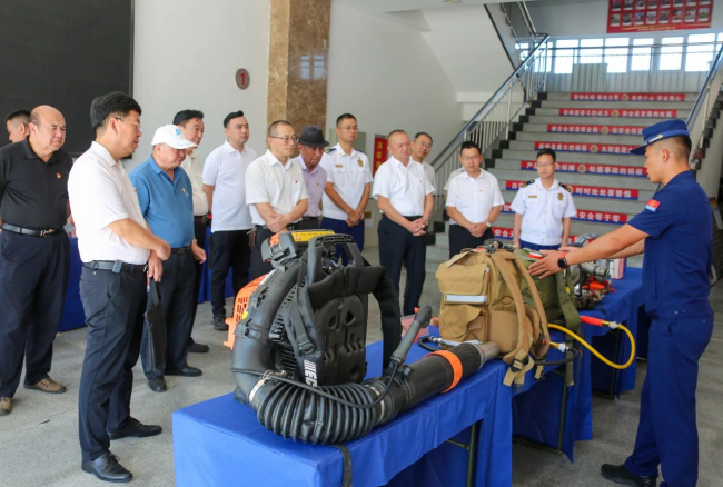 在营区,全体人员走进森林消防队伍,现场“零距离”体验“蓝焰”生活,在讲解员的带领下,观看支队水域、地震以及森林防灭火装备展示,现场穿着体验救援装备操作使用。随后,走进班级宿舍,观摩了队伍正规化建设成果,通过现场科普、装备演示、互动体验,大家进一步了解了各类车辆器材装备的性能、用途及森林消防员的日常训练成效,掌握了森林防火以及日常消防安全常识和技能。