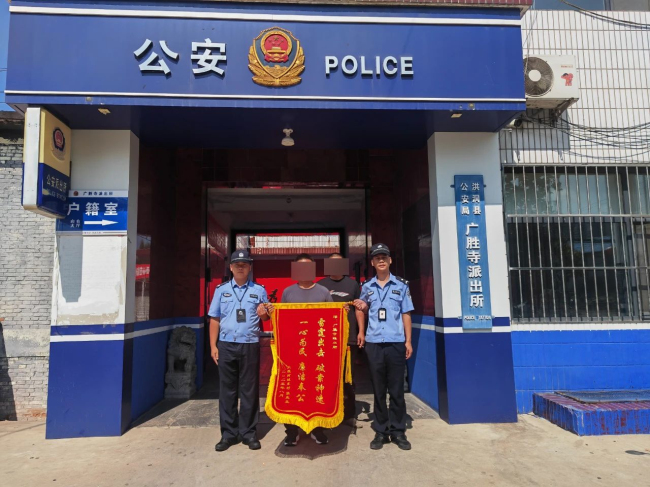 8月24日上午,市民张先生将一面印有“雷霆出击 破案神速 一心为民 廉洁奉公 ”的锦旗送到广胜寺派出所民警手中,对民警认真负责、高效服务的工作态度表示肯定。