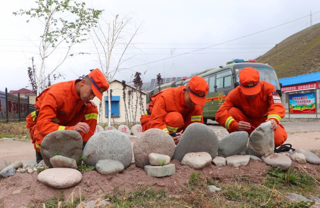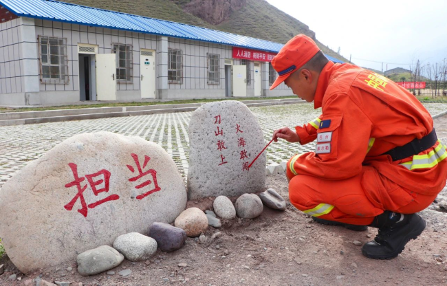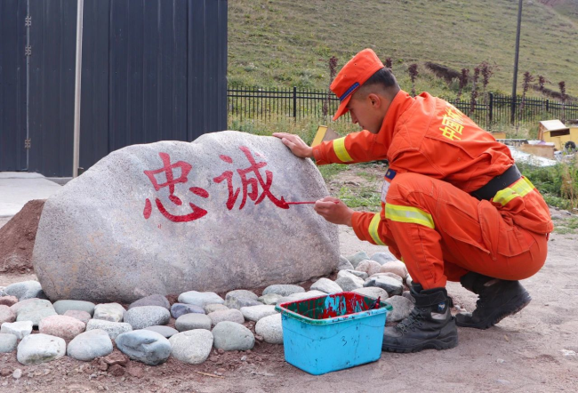 踏入巴州森林消防支队巩乃斯驻防分队的营区,一股石文化的气息扑面而来,随处可见各式各样的“文化石”,这些石头或矗立、或躺卧,色彩突出,形态迥异,上面刻着各种励志文字,每一块“文化石”无不浸染着烈日酷暑的印迹,无不诠释着森林消防员比石头更硬的意志。