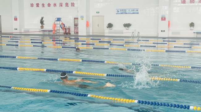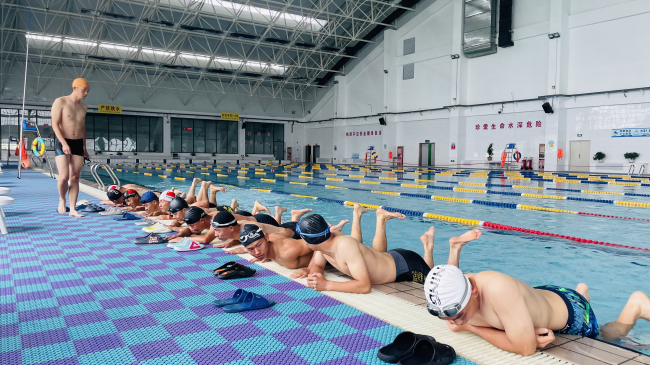 “要先吸一口气,含在嘴里,身体进入水中后,先蹬腿然后再抱水,一步一个动作,分步进行,同时在水中不要急着吐气,等头快要露出水面时再吐气,随即吸气,然后重复动作。” “游泳过程中,身体一定要放松,始终保持身体处于轻松自由的状态,慢慢寻找适合自己的游泳节奏……”教练员结合训练进程耐心细致地讲解着动作要领。