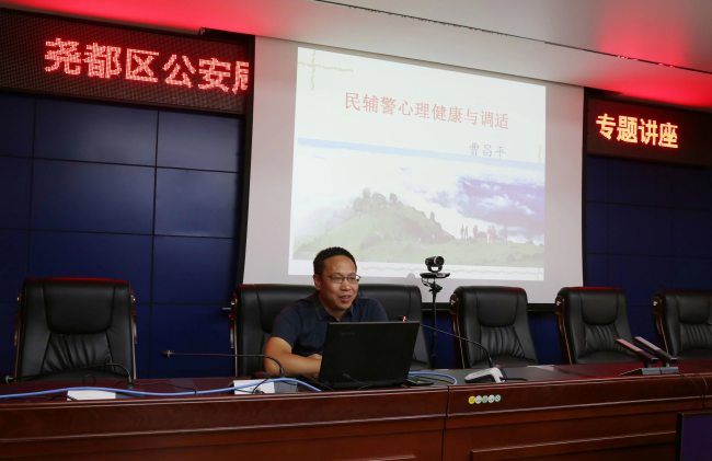 讲座中,曹昌平老师围绕什么是心理健康、影响心理健康的重要因素、压力与心理健康的关系、长期压力及不良情绪对健康的危害、心理健康的自我调适等五个方面入手,结合当前民辅警开展“夏季行动”等重点公安工作,循序渐进地讲解了如何进行自我心理认知、心理健康对身心影响、应对不良情绪和心理压力等心理学知识和技能,并通过视频观看、语言引导等方式带领大家进行压力情绪释放。
