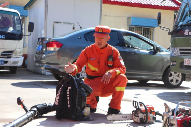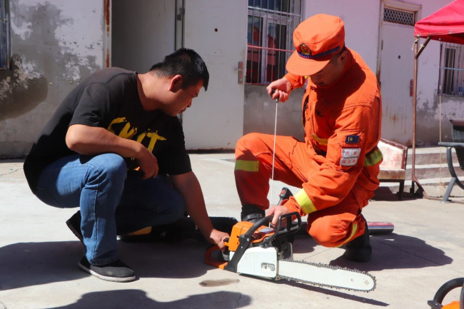 “斯蒂尔风力灭火机的发动机运用过程中机身稳定性强、风速高、风量大、操作简便……”在灭火装备讲解中,分队长田佳林说道。在灭火机具操作与使用中,消防员们重点对风力灭火机、水泵、油锯等灭火主战装备的操作使用进行指导,对水泵操作、单泵架设、并串联架设等内容进行训练,有效提高护林员队伍的专业技能。