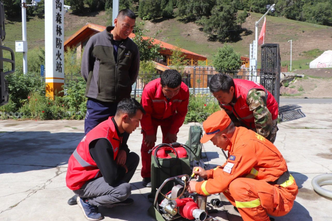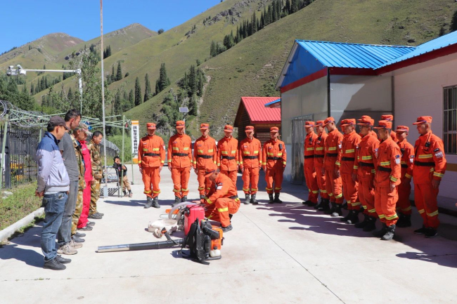理论来源于实践,也指导实践。针对地方护林员对灭火装备使用及维护保养不够熟练等实际,驻防分队安排业务理论知识和实战经验较为丰富的消防员向护林员们详细讲解机具的操作方法、注意事项、维护保养等知识,并组织护林员对风力灭火机、水枪、油锯、点火器等各类灭火装备逐一进行体验,对一些掌握较慢的同志采取“一对一”教学模式,手把手指导,确保护林员们真正学懂弄通。同时,巩乃斯国有林管理局应急分队全程跟队训练,驻防分队充分发挥“传帮带”作用,与应急分队“同学习、同训练、同执勤”,全面提升应急分队综合能力。