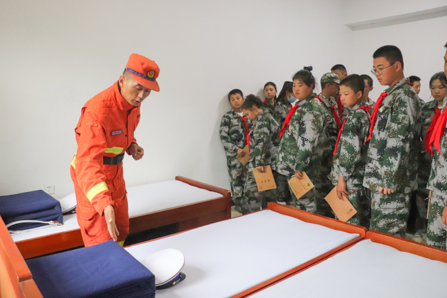 跟着中队长刁伟的步伐,大家首先参观了消防队员的内务环境。当学生们走进消防员的宿舍时,干净整洁的房间,棱角分明的被子,整齐划一的物品摆放,都让学生们惊叹不已!“好整齐的被子啊,像豆腐一样方方正正的,消防员叔叔教教我们,我们也要折出这样的被子!”听到学生们的请求,消防队员为大家大方展示叠被子的秘诀,学生们跃跃欲试,都想尝试亲手叠出“豆腐块”。