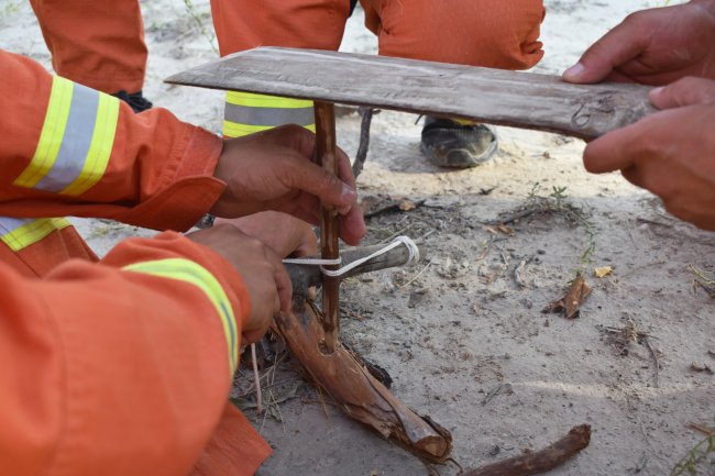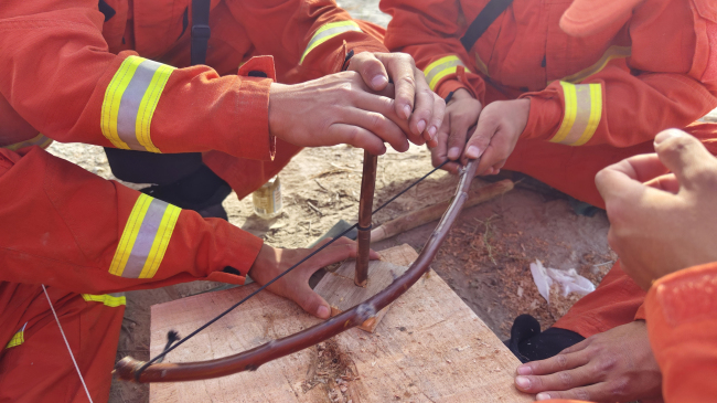 找到合适的钻板和钻头后,消防救援人员给树枝绑上绳子,做成一个弓,弓上缠上之前提到的“钻头”,然后用它们在钻板上迅速地旋转。并选择碎木屑、木绒、棉花或卫生纸等易燃物品来引火。