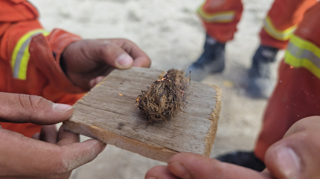 通过持续的摩擦和灵活的力度调整,大约经过15分钟,在消防救援人员不懈努力下,终于取得了“钻木取火”的初步成果。然而,这个时候火苗仍然非常脆弱,火星很容易熄灭。因此,他们必须慢慢地把火星吹成火苗,才能点燃木材。很快,火苗不断长大,消防救援人员将早已准备好的野战土灶拿出,将手中的火种放入摆满木材的灶膛中。不一会儿,火苗就蹭蹭燃起来了。