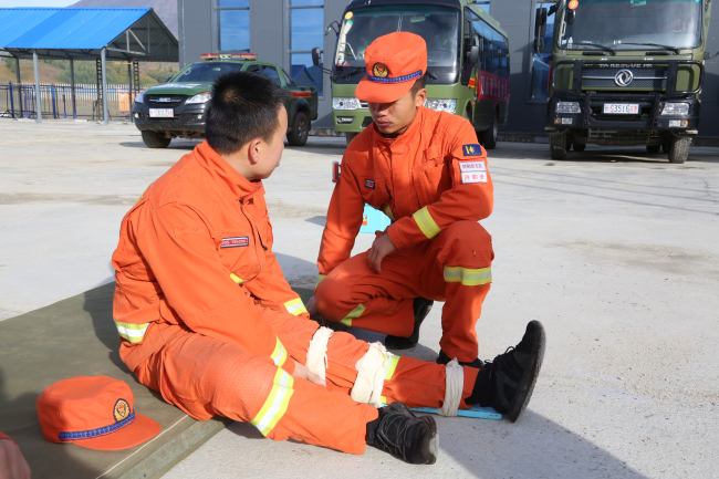 固定运用于四肢、脊椎等骨折,是骨折创伤救护的一项基本任务。正确、良好的固定受伤部位,可以最大限度地减少伤员的疼痛,同时避免对伤员造成其他组织损伤、神经损伤或开放性骨折等二次伤害。驻防分队分别从野外不同条件下就地取用器材入手,针对不同环境下不同的处理方式进行针对性训练。