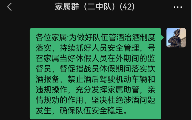 严格落实刚性措施,加强纪律管控,锁紧责任链条。大队利用家属联管,告知饮酒管控相关要求,让队伍和家属达成共同认识,充分发挥家属助管、亲情规劝的作用,号召家属当好休假人员在外期间的监督员。大队将坚持常态化落实管控措施,杜绝涉酒事件发生。