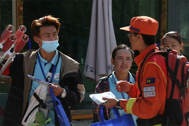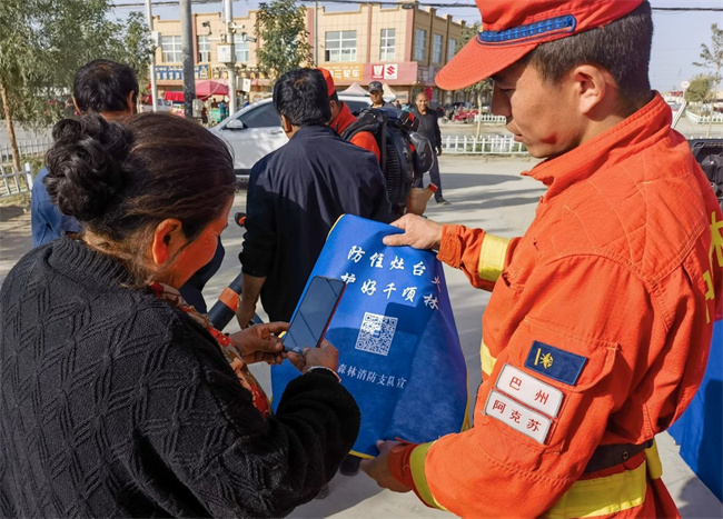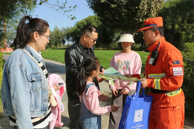 在库尔勒市体育公园、尉犁县罗布人村寨、阿克苏市胡杨岛生态乐园,指战员因地制宜、因时就势,结合地处实际区域,设置固定宣传点,摆放宣传展板、悬挂宣传横幅、播放科普视频、展示救援装备、发放森林防火宣传手册。耐心接受群众咨询,让群众近距离体验装备,为群众普及紧急避险常识和自救知识,广泛宣传有关保护森林资源的方针政策和讲解有关法律法规,不断提升群众森林防火意识和防灾减灾理念。此外,为提升宣传实际效果,邀请游客体验灭火装备,让大家在面对面实际体验中感受到预防森林草原火灾的重要性,号召游客志愿者,积极参与到宣传森林草原防灭火工作中来,并以“两微一抖”新媒体平台为载体,向社会广泛宣传法规、防灭火常识,全方位营造浓厚的宣传氛围。