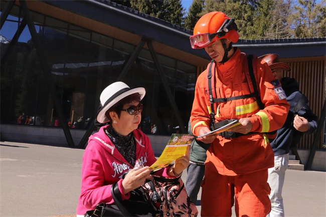 “不要携带火种进山,不要在景区吸烟、不要在山上野炊、烧烤食物……”活动期间,景区内指战员们身着橙色救援服,组成科普宣教小分队,穿行在游客之中,面对群众的连串问题,指战员一一耐心解答,并以实地演示和科普宣讲等形式为群众传授森林防火和防灾减灾知识,有效增强了森林防火的针对性和实效性,进一步使防火灭火理念覆盖到每一个角落,深入到每一人心中。