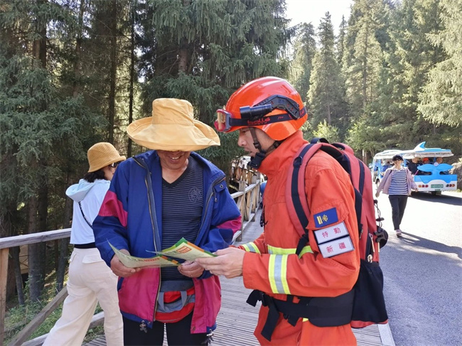 新疆天山天池地处新疆昌吉州阜康市南部山区,坐落在东部天山第一峰------博格达峰西北部的半山腰,紧邻首府乌鲁木齐。天山天池是以完整的山地自然景观垂直带和高山冰川、高山湖泊为主要景观特征,具有观光揽胜、科普考察、文化体验、运动健身、探险探秘、休闲度假、生态涵养等功能于一体的国家级风景名胜区。随着近年来的有力保护,林区资源增长迅速,可燃物载量逐年增加,加之“中秋”“国庆”双节期间上山游客增多,防火形势异常艰巨。驻防分队紧盯森林防火重点时段、重点部位、重点环节,多措并举促使防火专项行动纵深开展,取得实效。