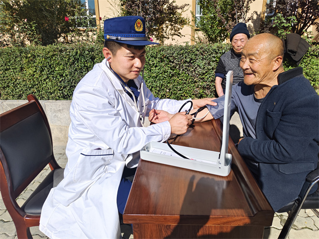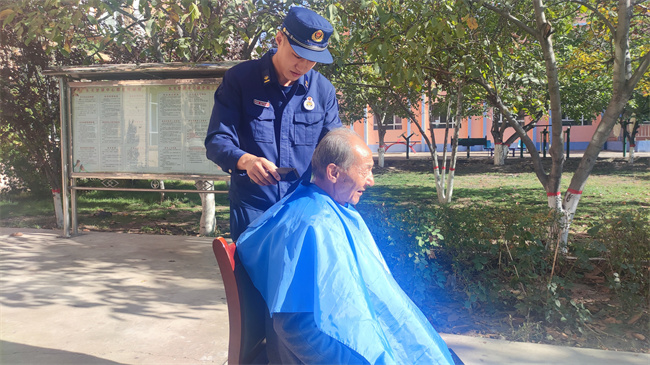 慰问活动中,党员先锋队指战员充分发挥自身特长,为老人理发、量血压、陪老人聊天、帮助收拾住宿卫生,用实际行动让老人们感受到温暖与关爱。“大娘,你现在的血压有些高,以后要注意饮食,避免油炸食品,多吃点清淡食物。”大队卫生员李成阳在为一名大娘测量血压这样说到。