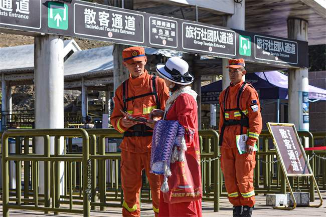 临近中午,完成巡护任务的队员们回到了景区入口。