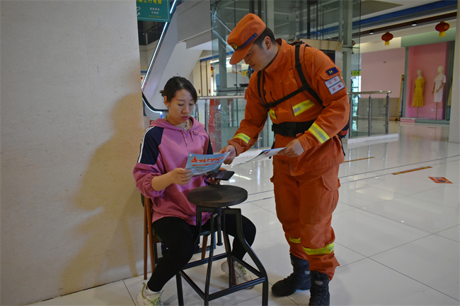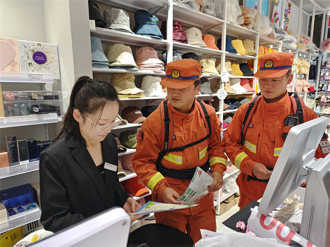 同志您好,我是森林消防员,如果您在林地内发现火情请立即拨打12119森林火灾报警电话,这段时间是咱们驻地的高火险期,请不要携带火种入林”。在防火宣传执勤一线,三级消防士袁成祥正在逐个商铺进行防火宣传。全体指战员通过走访商铺进行宣讲,打通了防火宣传“最后一公里”,使防火知识在群众之间口耳相传,确保防火意识走进每个人心中。