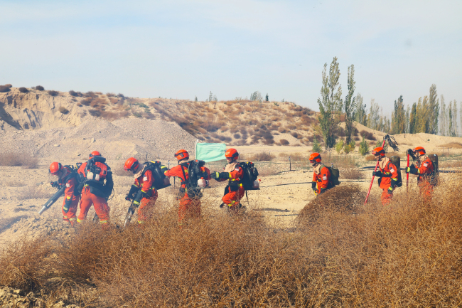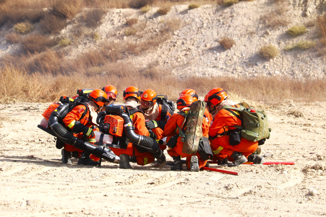 到达集结地域后,按照任务区域划分,全体指战员分工明确、紧张有序,一切准备就绪后,参演人员携带常规灭火装备和水泵等赴火场周边集结,指战员按照灭火预案各司其职,有条不紊地开展救援行动。“我们所处地带地势较为平坦,东风2⁓3级,风力稳定,植被比较稀疏可以打开突破口,我建议采取‘一点突破,两翼推进’和泵车结合的灭火战法迅速沿火线进行快速扑打。”到达火场后,指挥员和通信人员第一时间启动无人机组织火场勘察,制作火场全景图,实时监测火场态势变化。