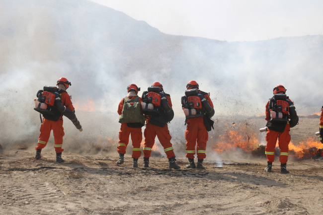 “爆破手,迅速在火场东侧打开突破口!随后三中队沿火线向右翼进行扑打,四中队沿左翼火线进行扑打。前方出现树冠火,水泵班迅速架设水泵向火场出击,对火头进行压制,常规分队跟进进行扑打清理!”经过1个多小时的紧张扑救,火场内明火全部扑灭,暗火也已清理完毕,待火场达到“三无”,演练人员集结完毕后,指挥员对此次演练进行了总结点评。