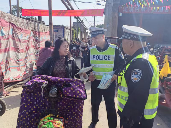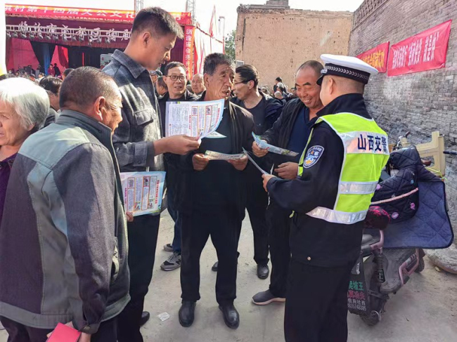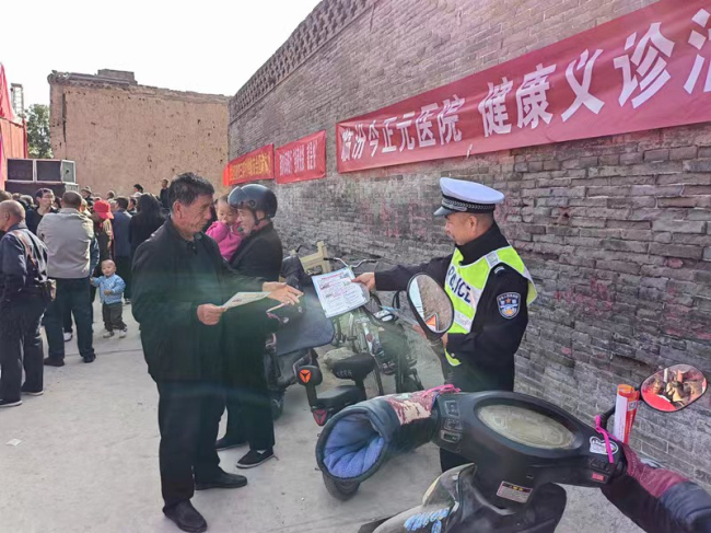 本网讯:(王新晋)为持续巩固“美丽乡村行”交通安全宣传教育成果。近日,尧都区公安局交警大队三中队民警走进辖区农村第十四届关公文化艺术节现场开展交通安全宣传活动。