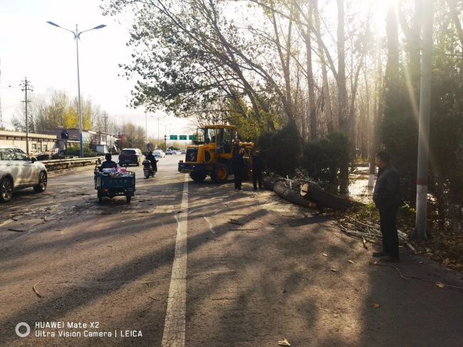 11月5日,洪洞出现大风天气,巡逻民警巡逻至108国道明姜镇路段时,发现树木倾倒在路面上,占用了部分车道,树枝散落在路面上,过往的机动车和非机动车纷纷躲避绕行,严重影响了过往车辆的通行。执勤民警立即一边在现场指挥过往车辆减速通行,防止交通事故发生,在做好一系防护措施后,一边与明姜镇政府、县公路段合力迅速处置“拦路”树枝,将树枝清理出路面外,在最短的时间内,清除了安全隐患,使道路恢复了正常通行。