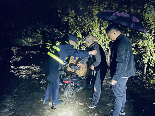 11月4日晚20时许,尧都区下着大雨,县底派出所值班民警接到群众报警称:有一个人骑电动车掉进了南乔村村西路边的排水渠里。接警后,派出所值班民辅警火速赶到现场,现场发现水渠是村里的污水、雨水的主要排放通道,老人躺在水渠底部,上身几乎被雨水淹没,一辆电动车压在老人身上,天冷水凉,极易造成人体失温。