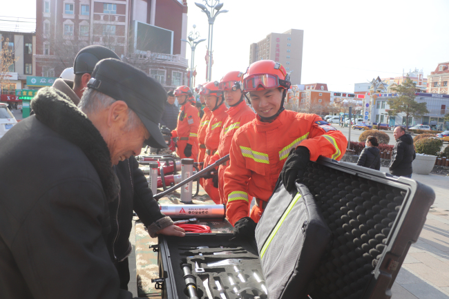 “大叔,您好!这是生命探测仪,在地震发生后,用于探测废墟中有无生命迹象……”活动现场,消防救援人员用通俗易懂的语言向群众讲解各类救援装备知识。