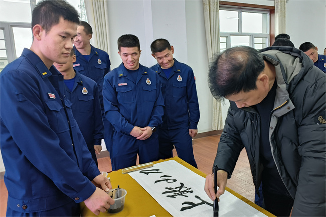 书法老师们感概地说“我们现在已经退休了,但看见你们这些年轻的面庞,让我们又感受到了年轻的活力,希望你们要永远保持优良的传统本色和作风,在消防救援队伍里好好干,多学知识,多学文化,练好本领,当好党和人民的守夜人’。