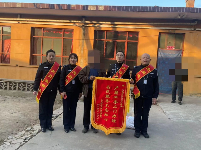 2023年11月20日,大槐树镇北王村党支部村委会将一面写有“户籍业务上门办理 为民服务不忘初心”的锦旗送到大槐树派出所民警的手中,感谢大槐树派出所党员先锋队深入辖区为行动不便的王某英送去补办户口本。