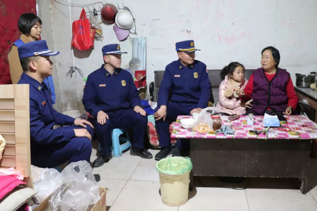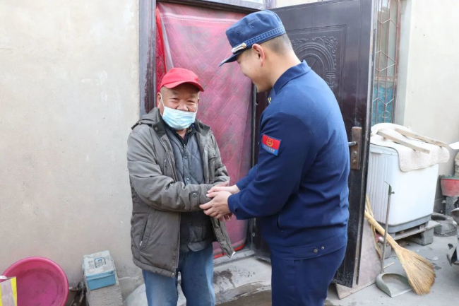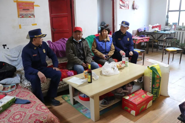 走访慰问中,大队长王召军带领指战员在社区工作人员陪同下,为困难群众送去了大队党委的关怀和生活慰问品。期间,大队长与困难群众深切交谈,了解近期的生活、身体状况等,叮嘱其要保重身体、乐观生活,如遇到困难一定要及时联系,大队将尽全力帮助解决。一句句温暖的话语,一声声关切的嘱托,使群众倍感温暖。同时,大队指战员还细致排查了困难群众家中的用气用电用煤安全,并提醒群众要注意用火用电用气安全。