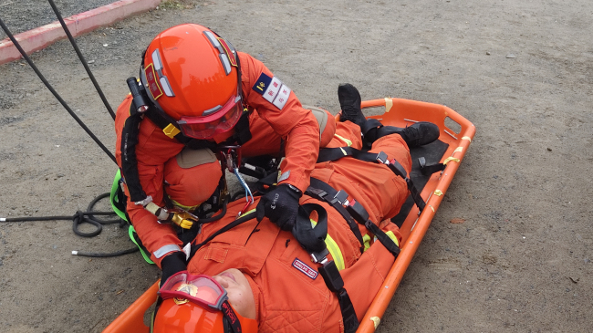 训练过程中,参训指战员克服高处带来的失衡感,针对现场救援环境特点,合理分工架设绳桥,制作适用性绳结和锚点,通力合作、密切配合成功完成假定被困人员的解救。“放绳!再放一点!收绳收绳!”指挥员一边指挥着全程,一边紧盯空中的先锋手,用时10分钟左右,携带船型担架营救“被困人员”成功着陆。
