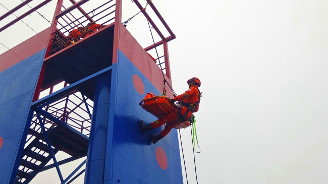 “先锋手到达指定位置完成作业,请求提拉……开始提拉。”这是模拟救援的训练场景,利用悬崖向救援技术对一名失足跌落悬崖者进行模拟救援,先锋手在对伤员进行认真细致的固定处理后,利用担架将伤员转移到安全区域。