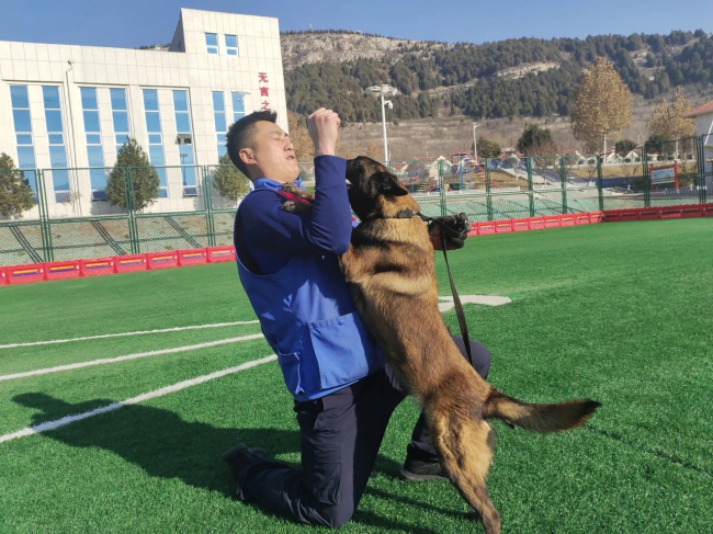 “小飒,上!快!跳!”,在山东搜救犬机动专业支队训练基地,搜救犬“小飒”正在训导员靳荣杰的指挥下进行日常训练。伴随着口令,今年8岁的搜救犬“小飒”始终和靳荣杰保持统一节奏,顺利完成单犬服从、过独木桥、穿越障碍、攀登等基础训练科目。