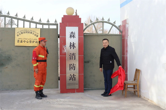 库尔勒市林业和草原局局长艾合麦提·热西提,巴州森林消防支队库尔勒大队一中队中队长侯学豪共同为普惠胡杨林区森林消防站揭牌。