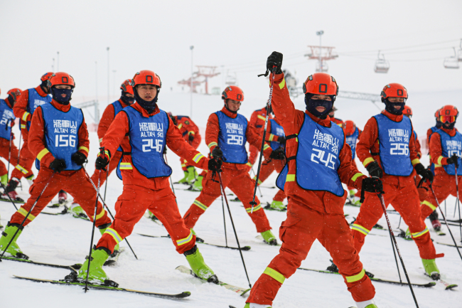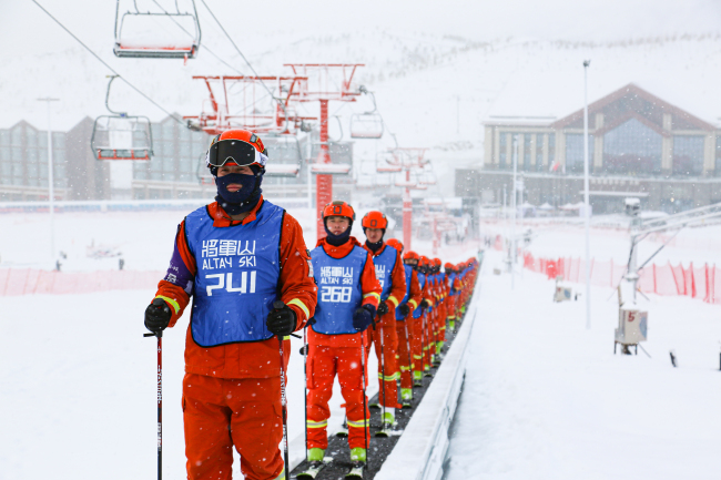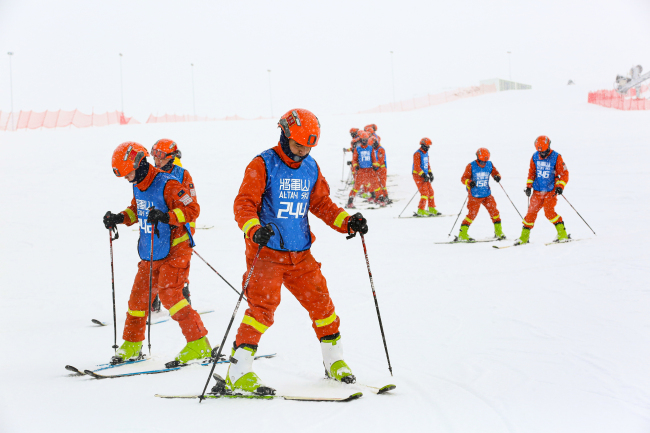 本网讯:(康冀)近期,新疆阿勒泰地区气温已降至-30℃,寒风呼啸、呵气成霜,但阿勒泰市将军山国际滑雪场却是一片热火朝天的景象。在茫茫雪道上,一名名消防救援队员正从山坡最高处沿着路线飞驰而下,他们队形排列整齐,放眼望去像一条巨龙一路蜿蜒而下。