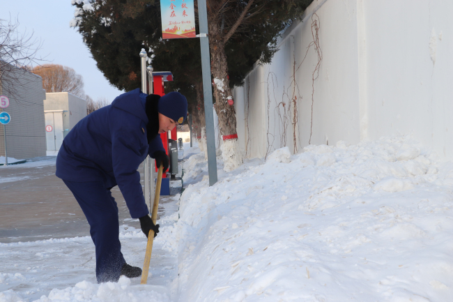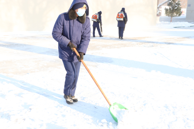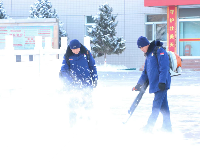 大队紧密结合干部骨干在位少、降雪频率高、路面积雪厚大大等实际,积极号召全体指战员参与到扫雪除冰行动中来。本着先突击清理后精细修整的原则,合理编配清理小组,指定干部骨干带头,重点对就餐前集合路面、人员往返频率多路线、车辆出入勤的营门前和当下训练急需场地进行集中打扫,而后分区域分路段逐个清理。同时针对不同区域的积雪深度和结冰情况,利用铲、雪机、推雪板、扫把、铁锹和购置工业用盐相结合方式边扫雪边除冰,实现了行动安全高效和顺利开展工作的双赢。