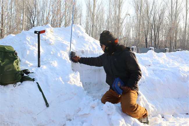 “了解你的装备并知道如何正确使用是很关键的,利用专业装备我们可以进行雪层勘测、雪层剖面检查、剪切测试。”彭超老师在雪堆上挖出一个30公分见方的雪坑,为培训队员们演示了雪崩搜救仪的使用方法,并使用卡片切雪进行表层雪剪切测试。“大家看,雪层薄弱层已经明确显示出来了。”在彭超老师的引导下,队员们纷纷用手在雪坑中感受雪层密度的变化。
